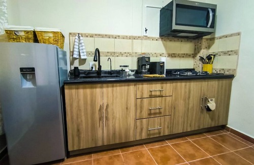 Cómodo apartamento en planta baja, con jardín interno y con cocina equipada con lo necesario para que te sientas como en casa. Cuenta con un sofá cama en la sala con medida de 170 cm. Recién renovado en Julio 2025, dentro de las amenidades ofrecemos amenidades en los baños así como café.