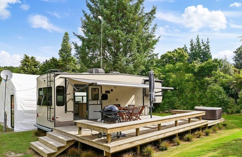 "Up market" USA made large 5th Wheeler mobile home well set up on large park like surrounds close to Lake Tarawera. A short drive (1.7ks) down to the Landing to launch your boat along with the Landing Cafe who deliver the best steaks! Or use our twin grill BBQ to do your own on the deck. The caravan has a good sized fridge and freezer, central heating and air conditioning, well equipped kitchen and outside bathroom, toilet equipped with washing machine dryer etc. There is the one main bedroom with a queen sized bed, plus a fold out couch that makes a second queen double bed.