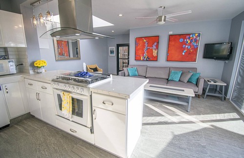 Chef’s Kitchen- fully equipped with refrigerator, stove, microwave, small appliances, and dishes.