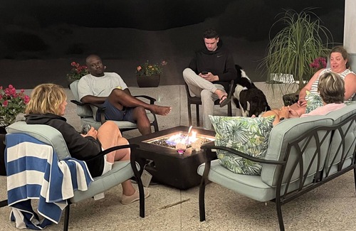 Out front you will find a BBQ grill, and dining table. Through the main double doors is the patio between the two wings of the home. More chill seating options, along with a fireplace for cool Fall evenings. Gorgeous views of the sea.