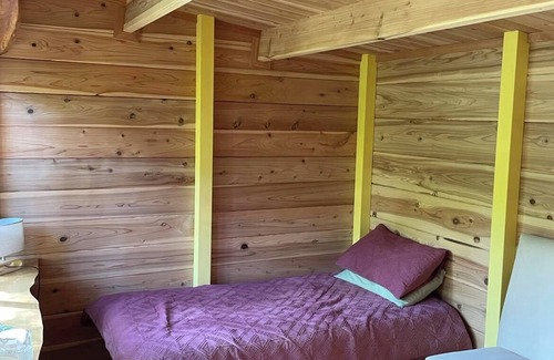 Bespoke, cozy cabin in amongst nature, steps into the space. Choose a queen or two single beds. Sleeps 2 adults, or 1 adult and 2 children.